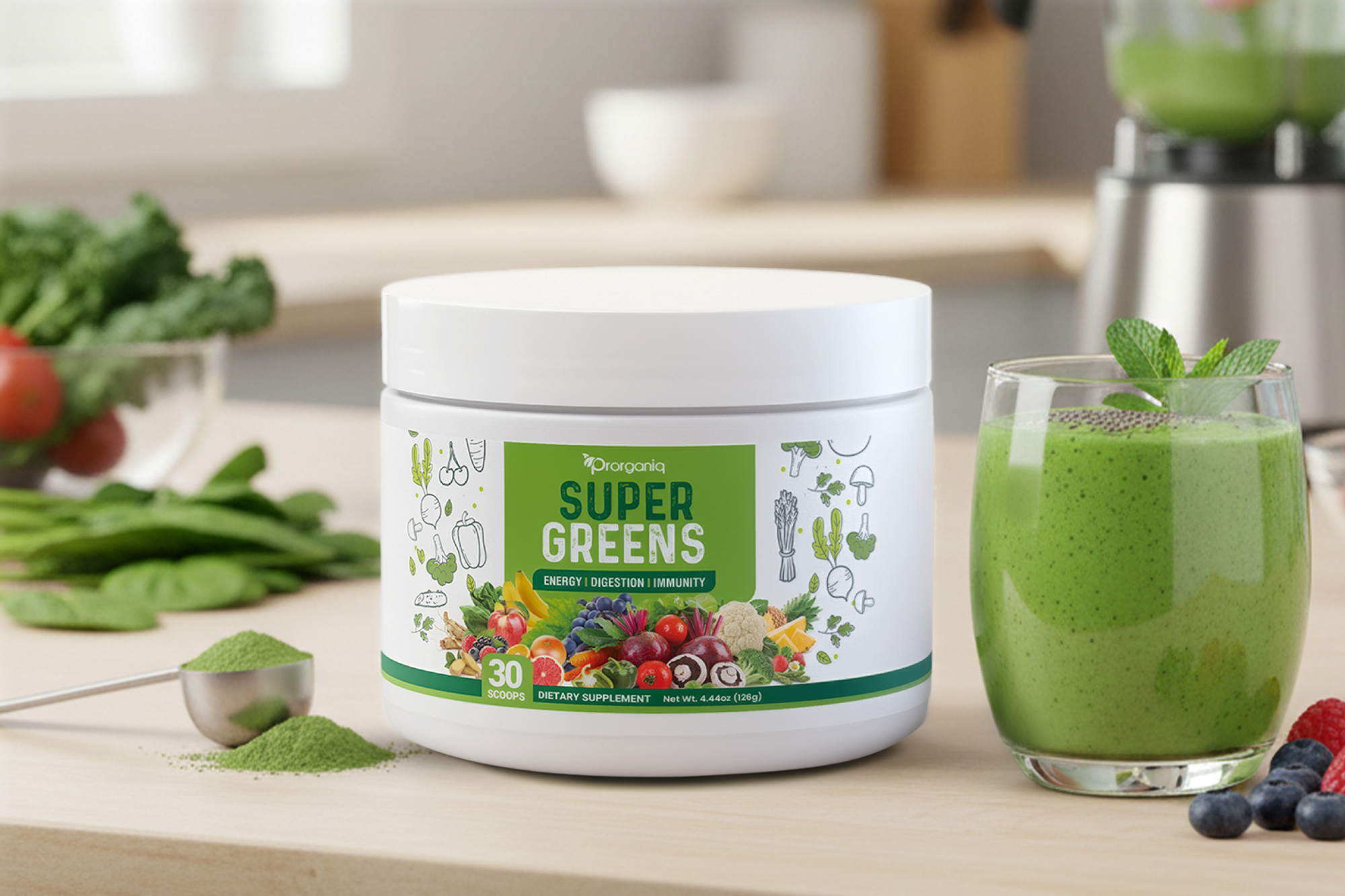 A plant-based greens powder designed to support daily nutrition and overall wellness.
